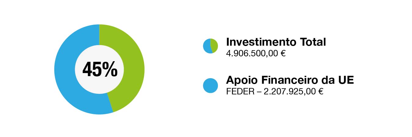 Data de aprovação | 18-07-2018 Data de início | 27-02-2018 Data de conclusão | 2021-02-26 Custo elegível | 4.906.500,00 € Apoio financeiro da União Europeia | FEDER 2.207.925,00 €
