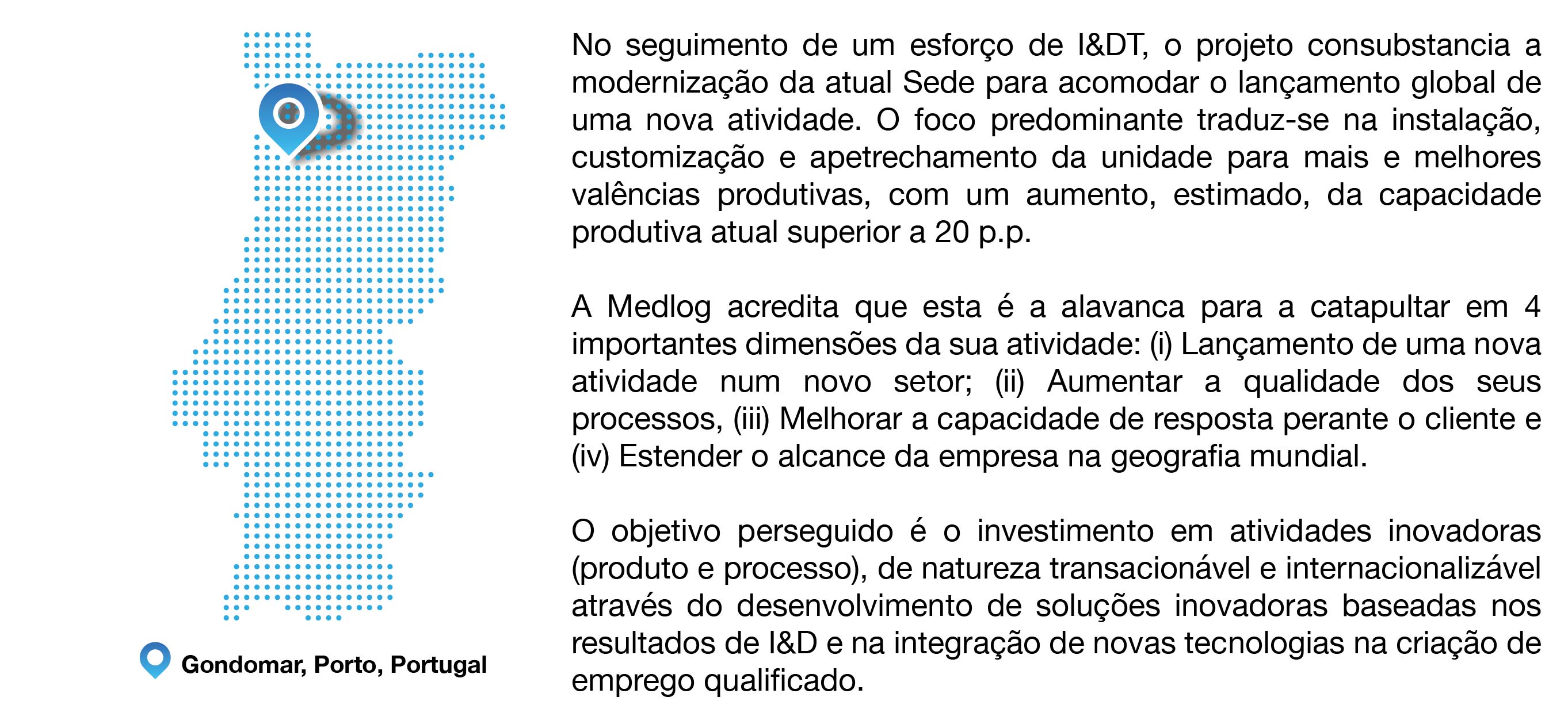 Projeto nº: 23991 Designação do Projeto | Revamping the Value Chain (SIG Global Launch) Apoio no âmbito do Sistema de Incentivos à Inovação Produtiva Objetivo Principal | Reforçar a investigação, o desenvolvimento tecnológico e a inovação. Região de intervenção | Norte Entidade Beneficiária | MEDLOG – Logística Farmacêutica S.A.